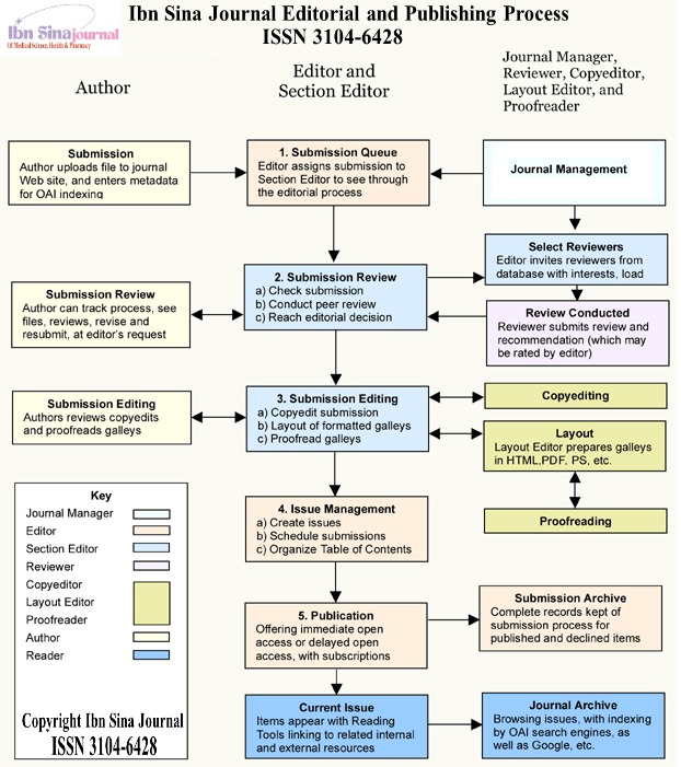 Manuscripts are first reviewed by the editorial office to check if they are in line with the scope of the journal and if they meet all its specific requirements. Once a manuscript successfully completes the editorial office review process it is sent for blind peer reviewing to two anonymous reviewers who have expertise and special knowledge of the subject area of the manuscript. The peer review system is double-blind so that both authors’ and reviewers’ identities are concealed. editors will approach peer reviewers “who have not previously co-published extensively with the author(s), who are for this and other reasons free of known bias in relation to the subject matter, the author(s) and/or their institutions, and who can cover, from a position of authority and peer expertise, the topic(s) dealt with in the paper concerned.” Reviewers are invited to review the manuscript by sending them the abstract of the manuscript. Upon acceptance to review the manuscript, the full text of the manuscript is sent to the reviewers after the author(s) have been concealed. Reviewers are required to provide a report in writing with clear recommendations for acceptance of the paper, with or without any revision, or rejection. If the two reports differ widely, the editor may invite a third reviewer. The reviewing process relies on the availability of qualified and expert reviewers and it may take up to 2 to 8 weeks to complete. Ibn Sina Journal of Medical Science, Health & Pharmacy endeavors to have papers reviewed within a one to four week period where possible. The review process may, however, take longer than this. Ibn Sina Journal of Medical Science, Health & Pharmacy editors mediates the blind reviews with authors. All reviewers’ comments are sent to the author(s) who are requested to make the necessary adjustments and resubmit their manuscripts to the editors. The journal’s editors will check that all recommended changes have been substantively attended to. Authors are required to submit a report to the editors, documenting how they have responded to reviewers’ suggestions and recommendations, using the online submission.